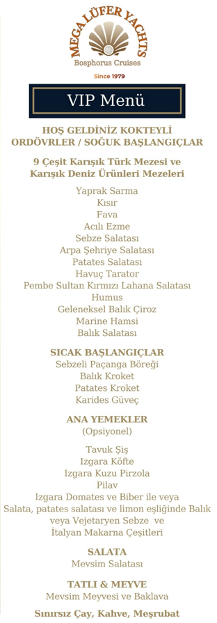 Akşam Yemekli Boğaz Turu VIP SalonLüks VIP Menü Limitsiz Alkollü İçeceklerKişi Başı: 3.840 TL |