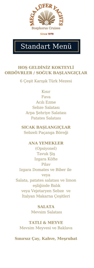 Akşam Yemekli Boğaz TuruStandart Menü Limitsiz Alkollü İçeceklerKişi Başı: 1.880 TL |