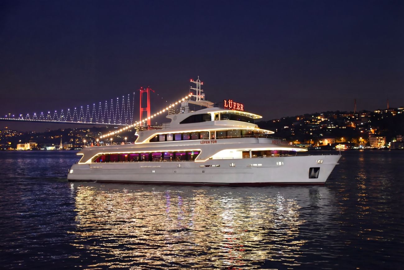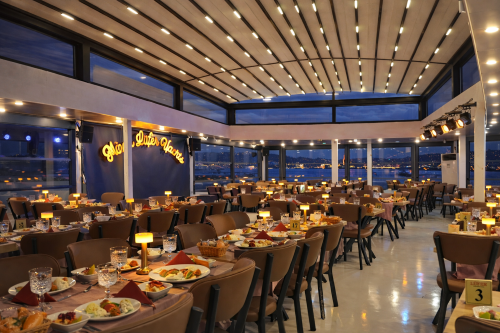 Her akşam kesin kalkışlı yemekli boğaz turlarımız 500 kişi kapasiteli 3 katlı lüks MEGA LÜFER YATLARIMIZ ile yapılmaktadır.Boğaz’ın muhteşem manzarası eşliğinde, enfes yemekler,seyrine doyamayacağınız sahne performansları ile harika bir akşam yaşayacaksınız.